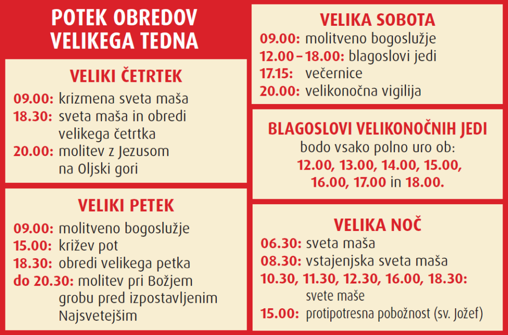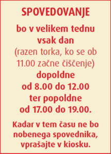 SPOVEDOVANJEbo v velikem tednuvsak dan(razen torka, ko se ob11.00 začne čiščenje)dopoldneod 8.00 do 12.00ter popoldneod 17.00 do 19.00.Kadar v tem času ne bonobenega spovednika,vprašajte...