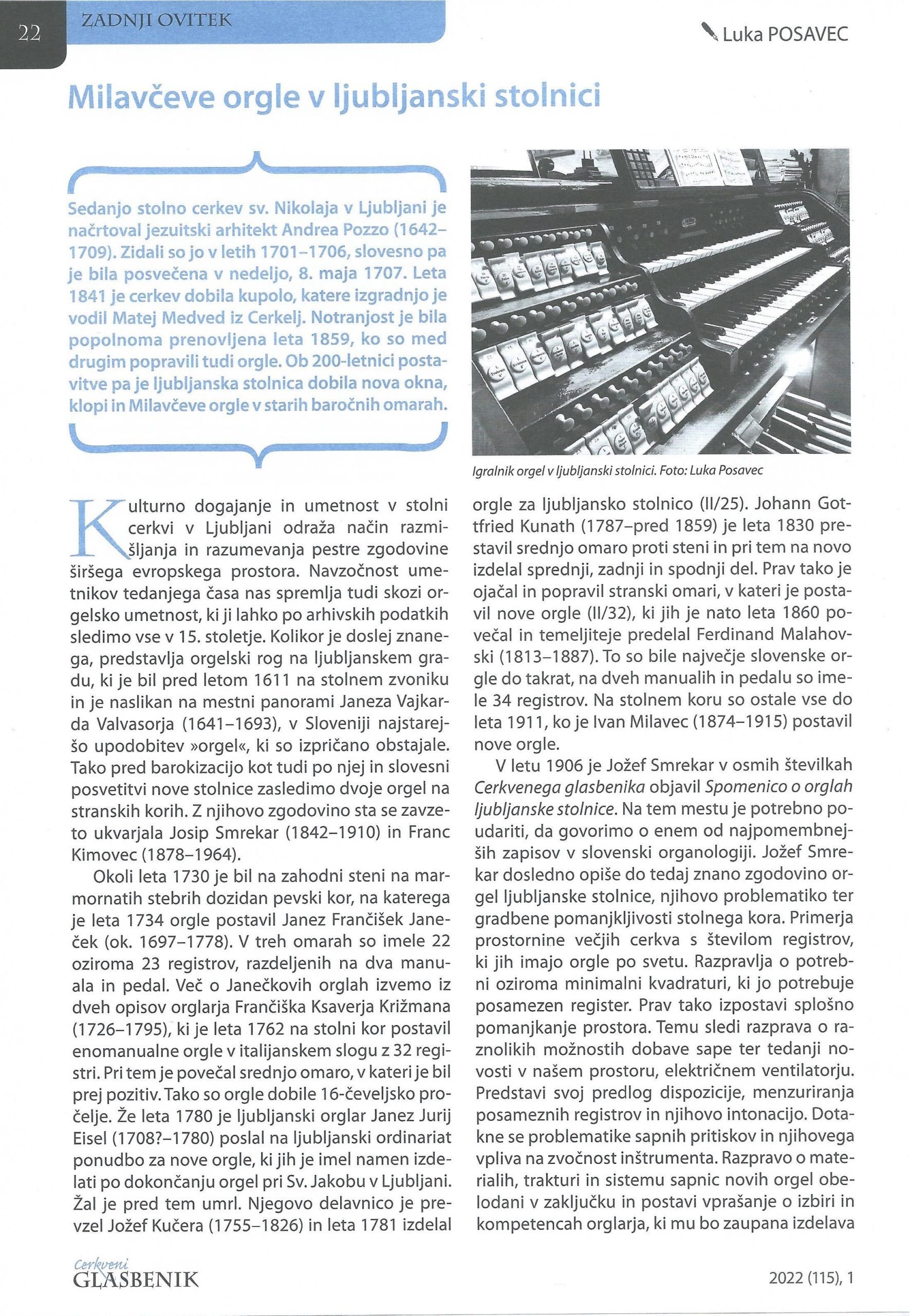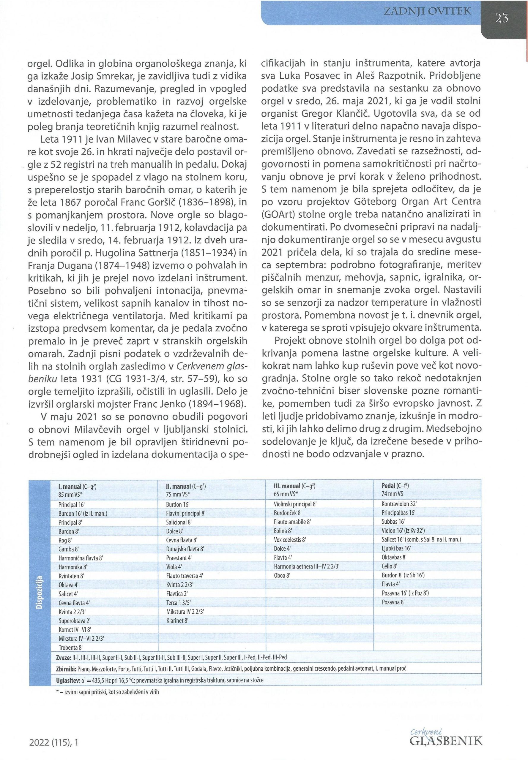Milavčeve orgle v ljubljanski stolnici, Cerkveni glasbenik (letnik 115, št. 1), Ljubljana: Založba Družina, 2022, str. 22-23