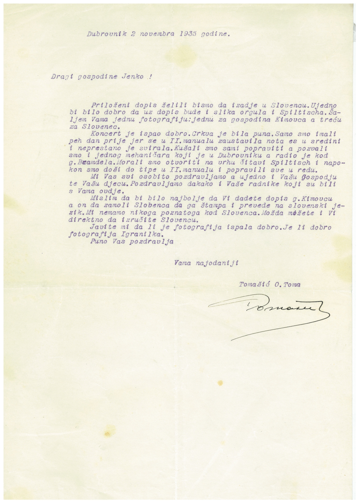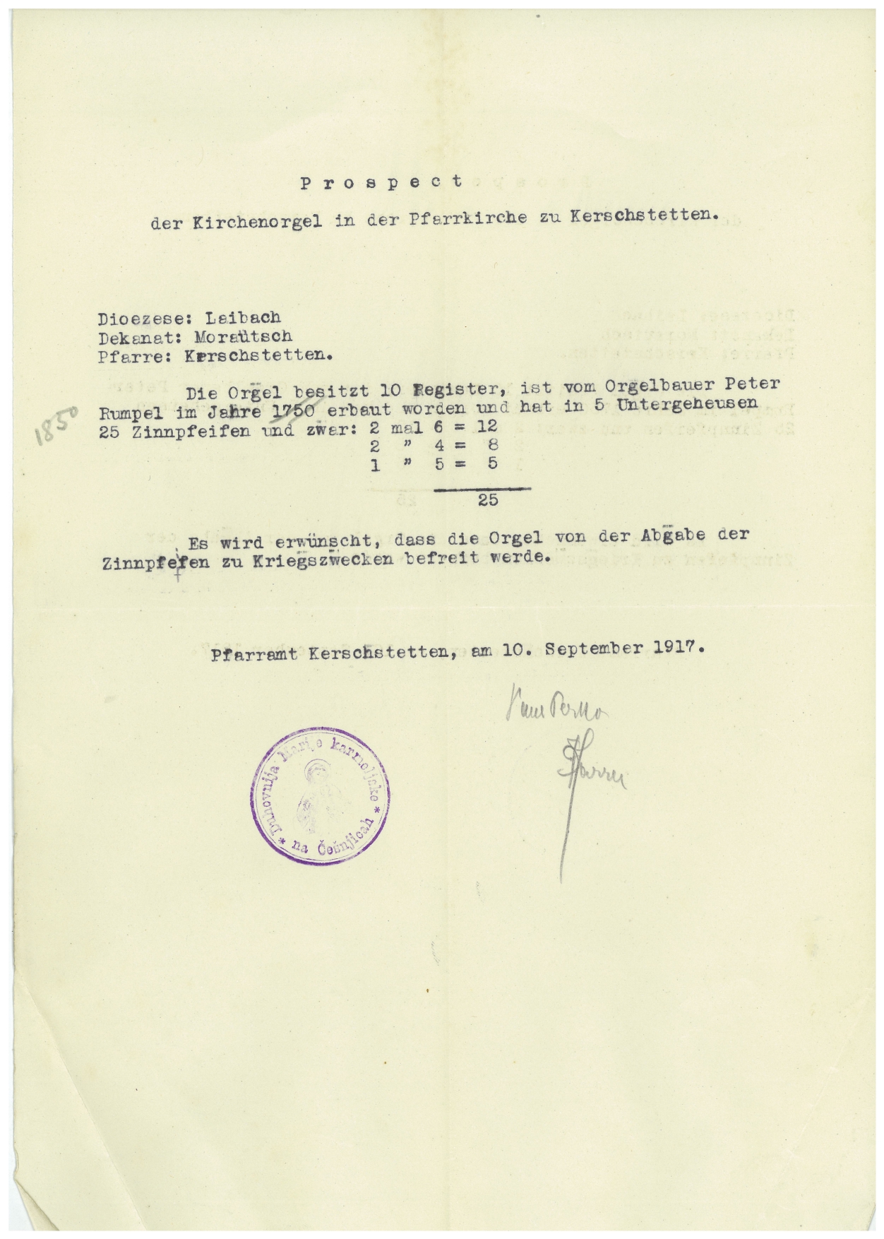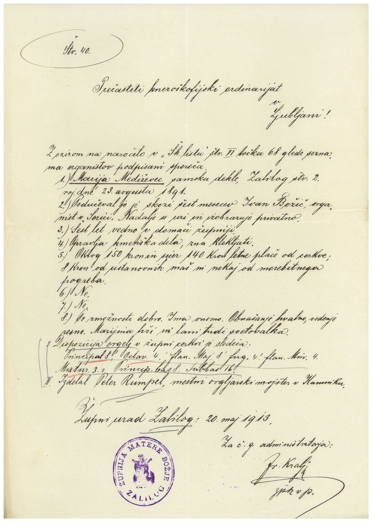 Zahvala ob odkritju gre še posebej ravnatelju orglarske šole v Ljubljani in regens chori Lj – stolnice Gregorju Klančiču, ki mi je ohranjeno dokumentacijo predal in s tem poskrbel za varno prihodnost in boljše razumevanje neprecenljivega dela naše zgodovine. Dokumentacija je v celoti digitalizirana in čaka na ureditev oz. ustrezno klasifikacijo!