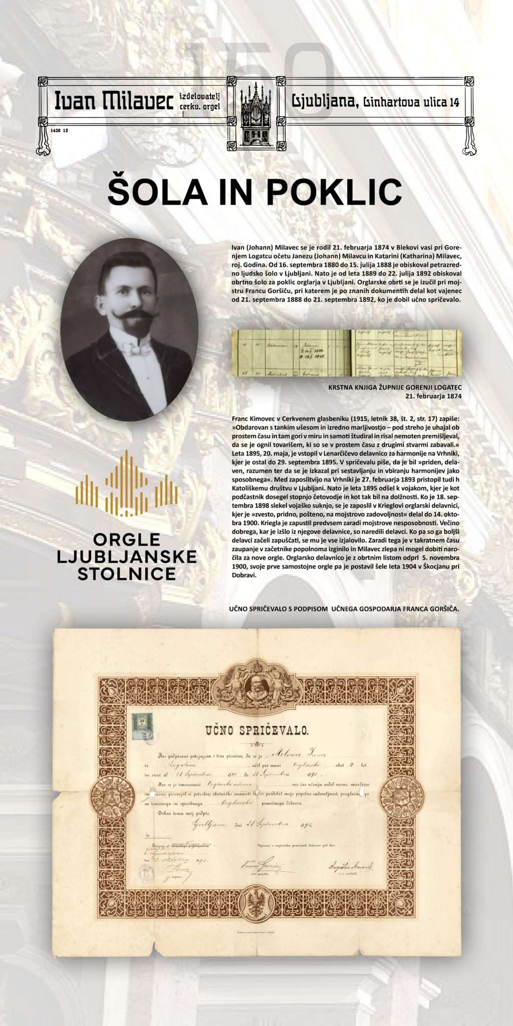 V torek, 22. oktobra, bo na Dolničarjevi ulici 1 ob 16:00 v okviru slavnostne otvoritve projekta obnove Milavčevih orgel v ljubljanski stolnici potekala tudi otvoritev razstave o Ivanu Milavcu. Vljudno vabljeni!