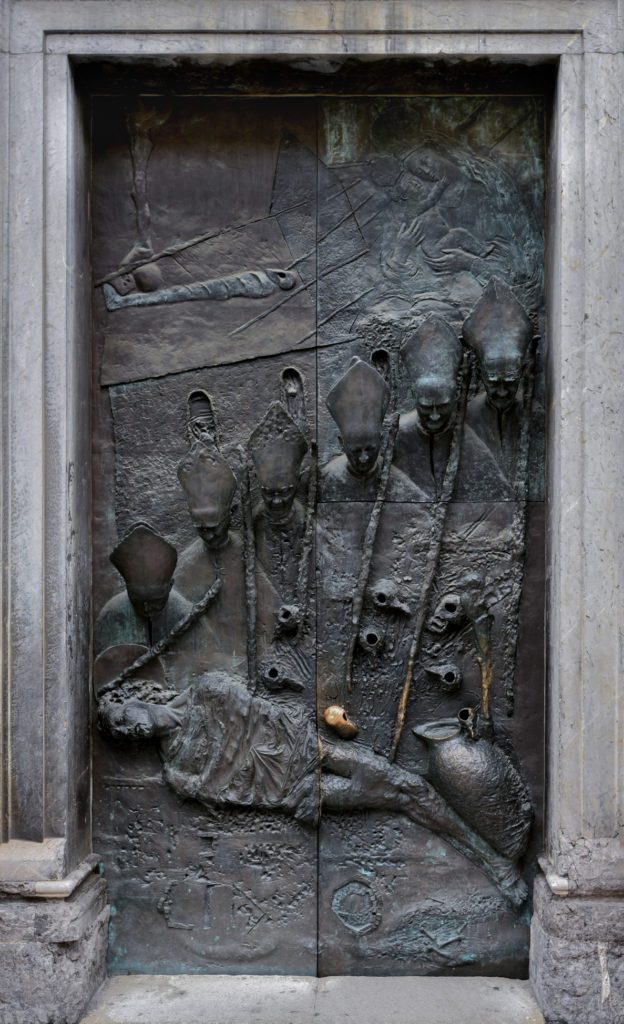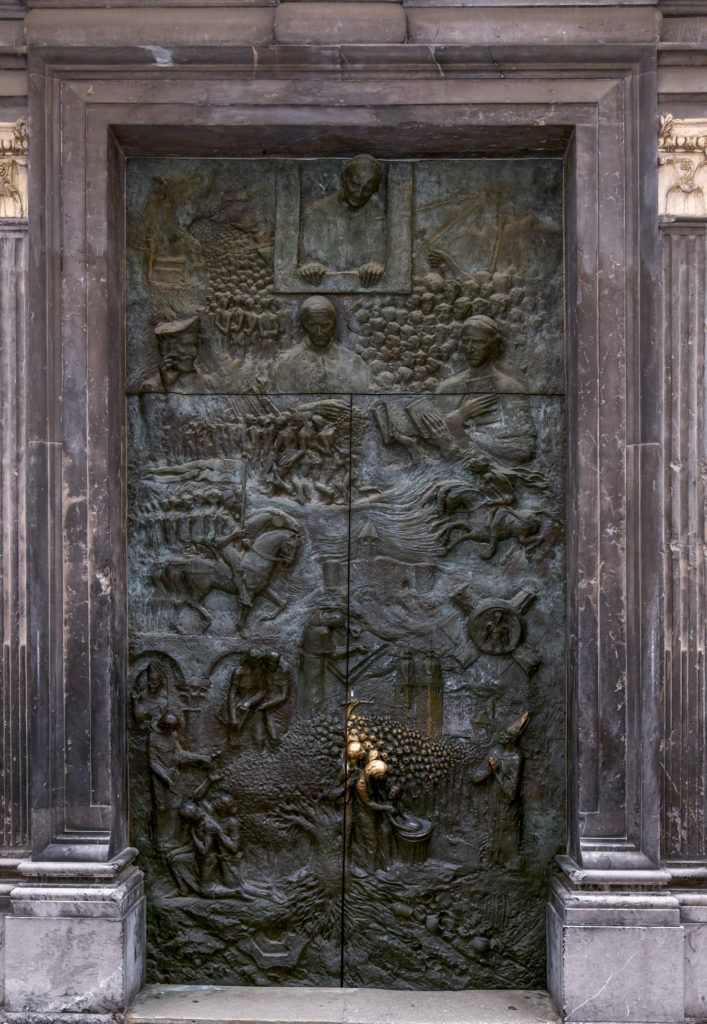 Idejno jih je zasnoval Franci Petrič, izdelal akad. kipar Mirsad Begić, ulil pa Borut Kamšek. Vrata pripovedujejo zgodovino ljubljanske (nad)škofije V 20. stoletju, ker predstavljajo ljubljanske škofe V tem času. Vsi škofje s svojimi pastirskimi palicami črpajo moč iz Kristusa, ki leži mrtev ob njihovem vznožju, feniks, ptica nesmrtnosti, V levem kotu nad njimi, pa pripoveduje o njegovem vstajenju.