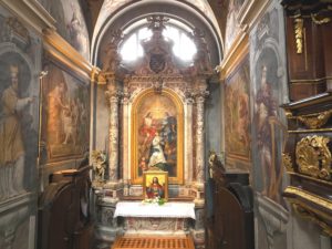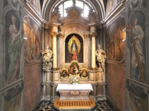 Pred uvedbo bogoslužja v novi stolnici leta 1706 je Quaglio kapele le zasilno okrasil s poslikavo oltarnih ozadij: štiri sprednje kapele s puti, ki držijo vijoličasto draperijo (nabrano zaveso), v zadnjih dveh kapelah, Barbarini in Magdalenini, pa je naslikal še podstavke in kipe. Stene in oboke pa je okrasil s freskami šele v letih 1721–1723, skupaj s sinom Raffaelom in drugimi pomočniki, kar se vidi tudi v drugačni kvaliteti. Kapela