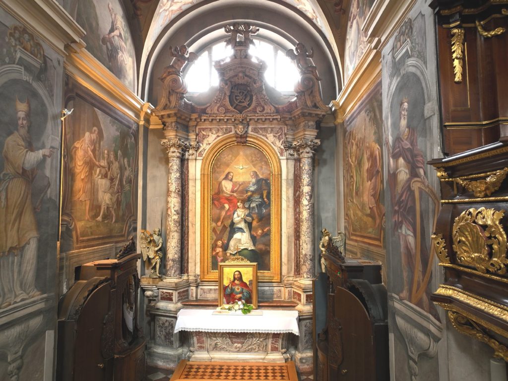 The frescies in St Trinity’s chapel contain several figures from the Old Testament. On the right and the left (large) pictures Abraham recieves three travellers in the shape of angles and entertains them to a meal; two minor pictures above show St Elias in the desert, and the angel bringing him food. The ceiling-piece represents Jacob’s dream – a ladder with angels to Heaven. The frescoes at the entrance to the chapel show Aaron and King David (on the right), and in his altar-piece Langus portrayed Mary’s coronation. Both angels of this altar have been moved to the altar of Helpful Mary. In this chapel, the Cathedral’s benefactor, Baron Codelli, was buried.